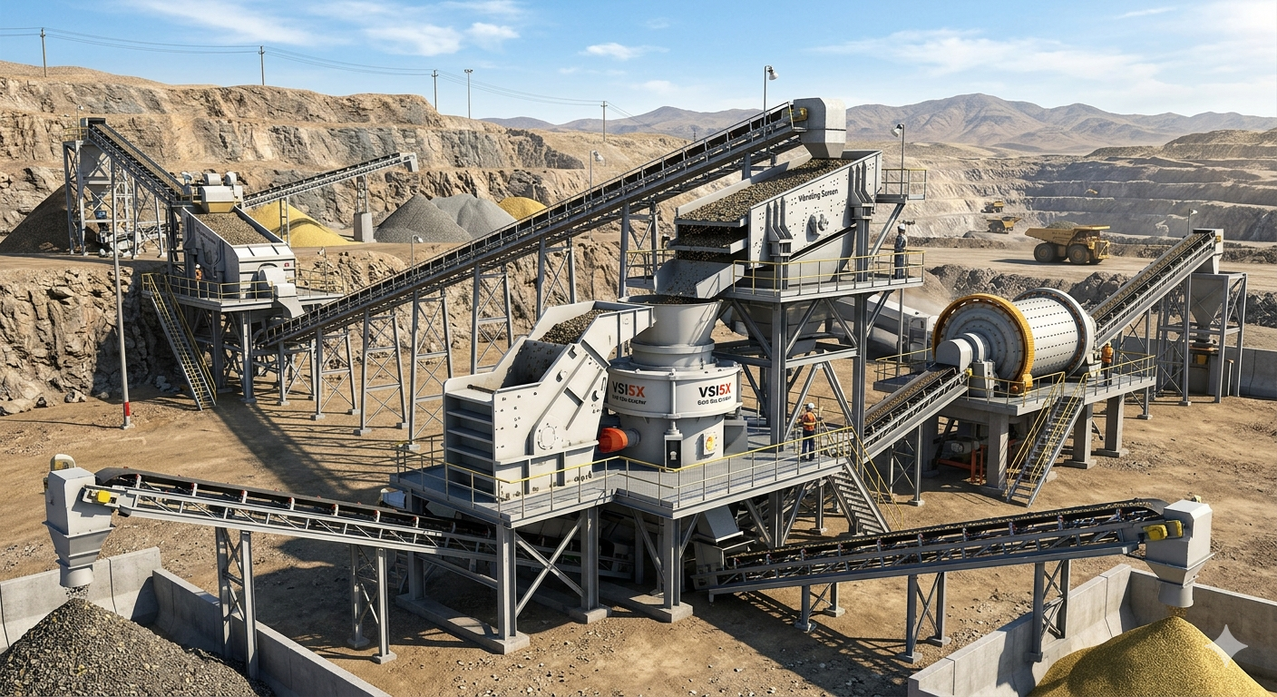 200t/h配置:●PE-750×1060颚破(110kW)●HPC-315圆锥破(315kW)×2台●MQG-2740球磨机。总投资520-580万元,回收率可达92.3%。