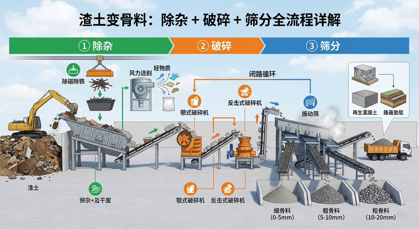 2026-04-18城市建设每天都在产生大量渣土——地铁开挖、楼盘基础施工、道路改造……这些渣土往往混杂着碎石、泥土、砖渣、金属杂物,大量倾倒不仅造成环境污染,处置费用也是一笔不小的开支。但很少有人知道:经过专业的除杂、破碎、筛分处理,这些看似毫无价值的渣土,完全可以转化为市场热销的再生骨料,实现变废为宝、以废制废。本文将完整解析渣土变骨料的全工艺流程。