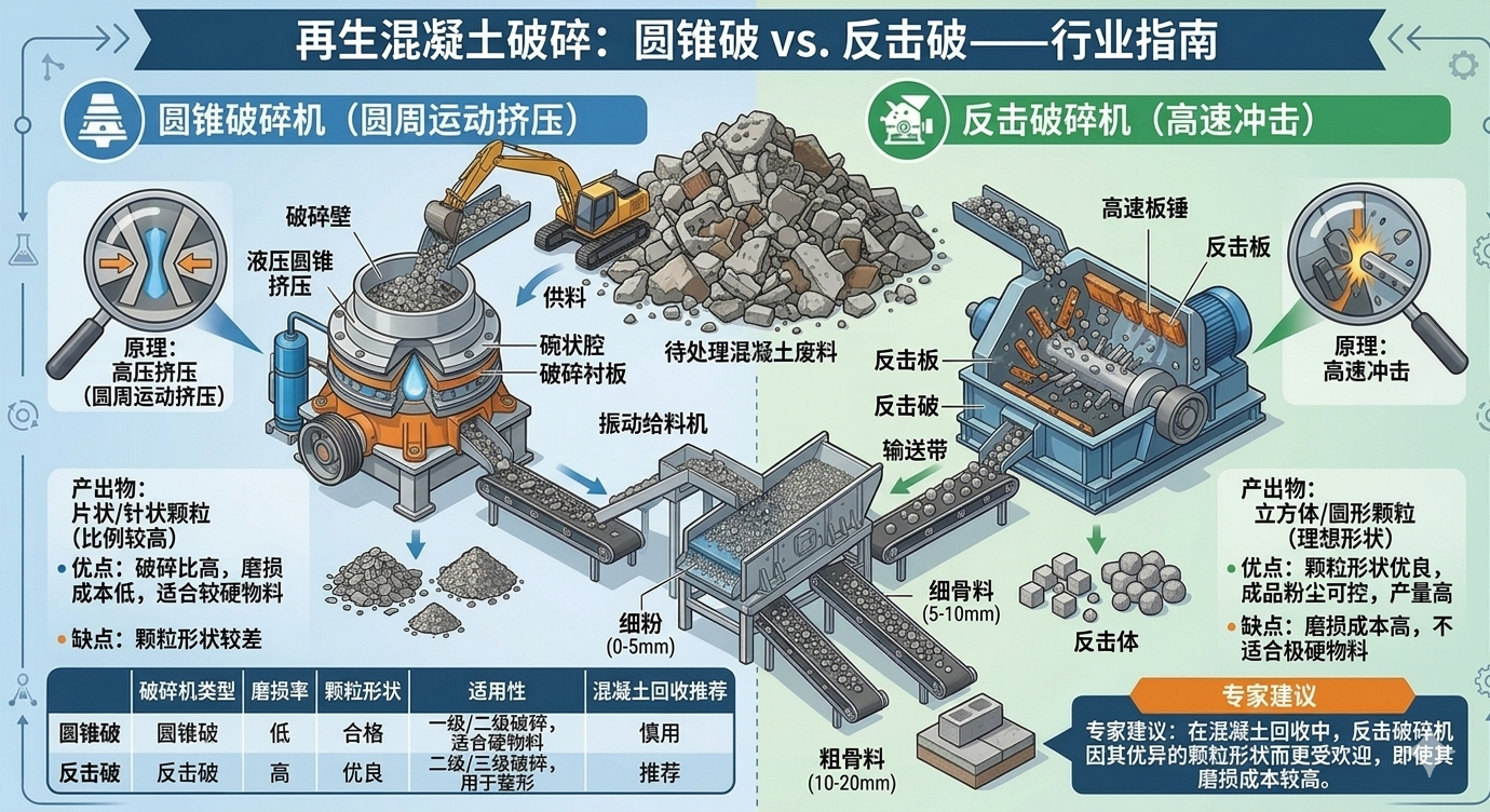 建筑垃圾处理赛道快速兴起,越来越多的投资者开始规划再生骨料生产线。在设备选型阶段,一个高频问题摆在眼前:混凝土块的细碎环节,到底该用圆锥破还是反击破?