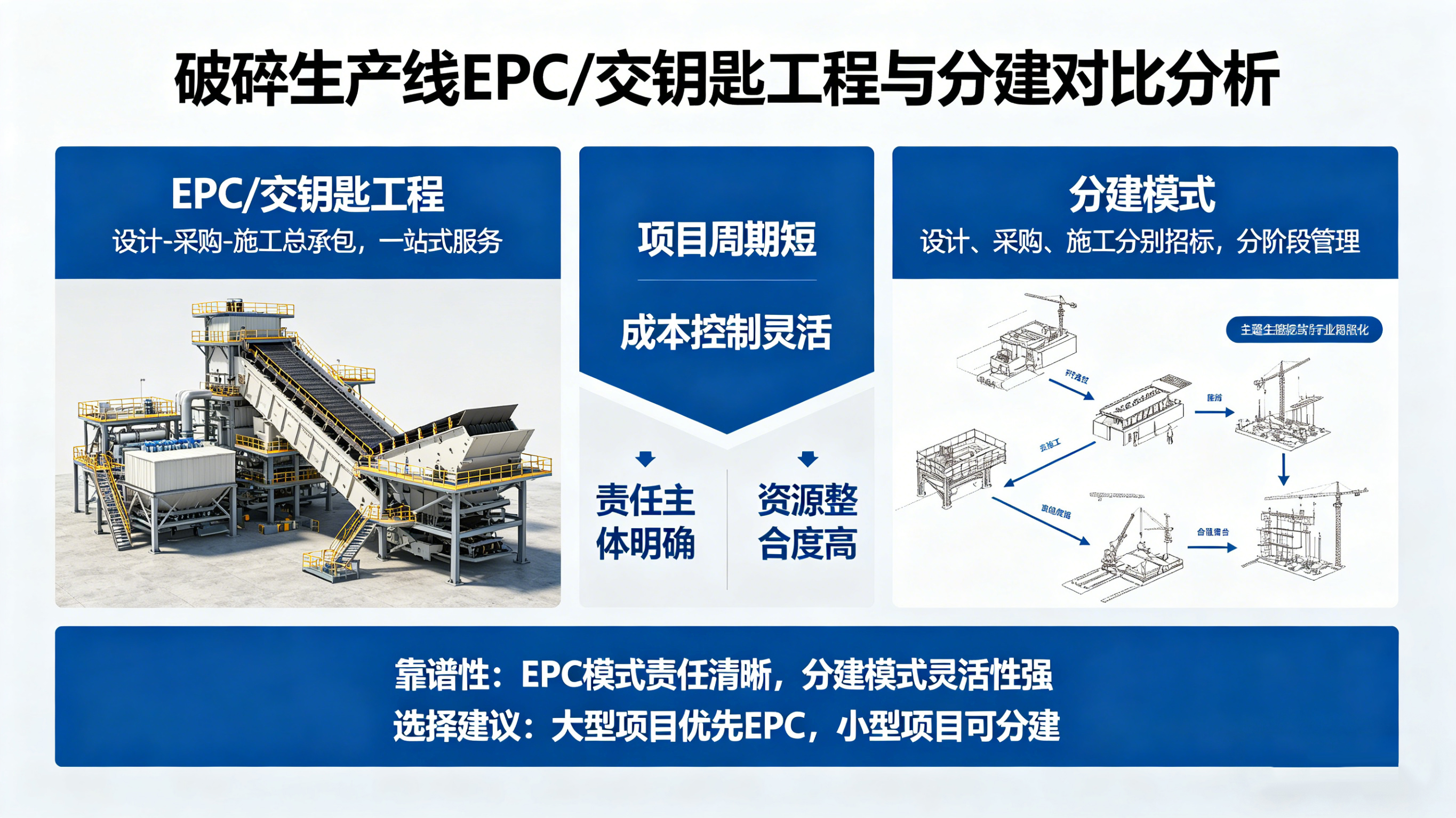 投资一条时产200吨的破碎生产线,设备、土建、安装、调试、培训……每个环节都需要决策。很多业主在签合同时面临两种选择:找一家厂商"一揽子搞定"(EPC总包/交钥匙),还是自己分头采购、各专业分包(分建模式)?